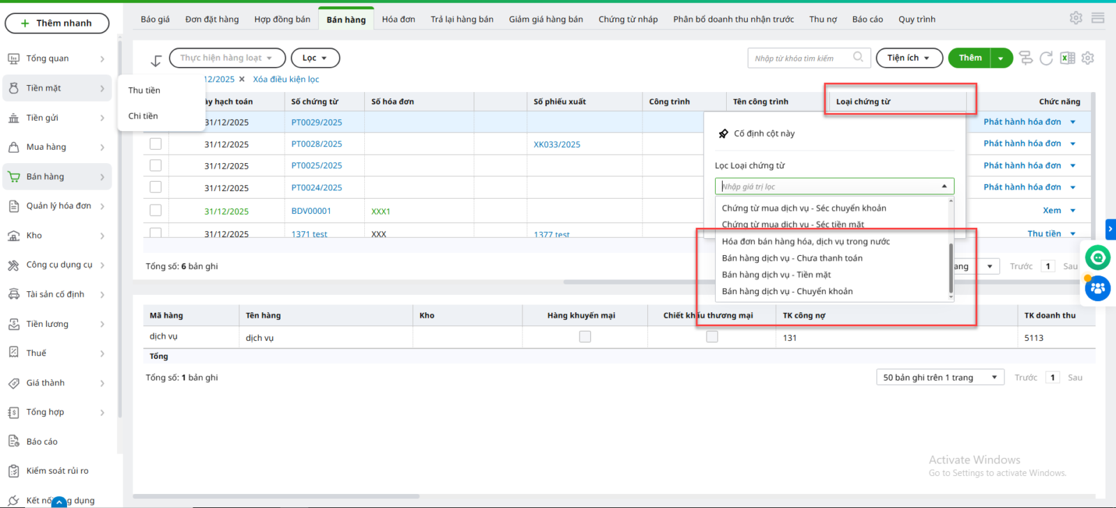 - Muốn lọc được loại chứng từ trên danh sách bán hàng thì: phân hệ Bán hàng\ chọn biểu tượng Bánh răng (tùy chỉnh giao diện) \Tích hiển thị cột Loại chứng từ \ Thực hiện lọc chứng từ bán hàng hoặc bán dịch vụ trên cột Loại chứng từ