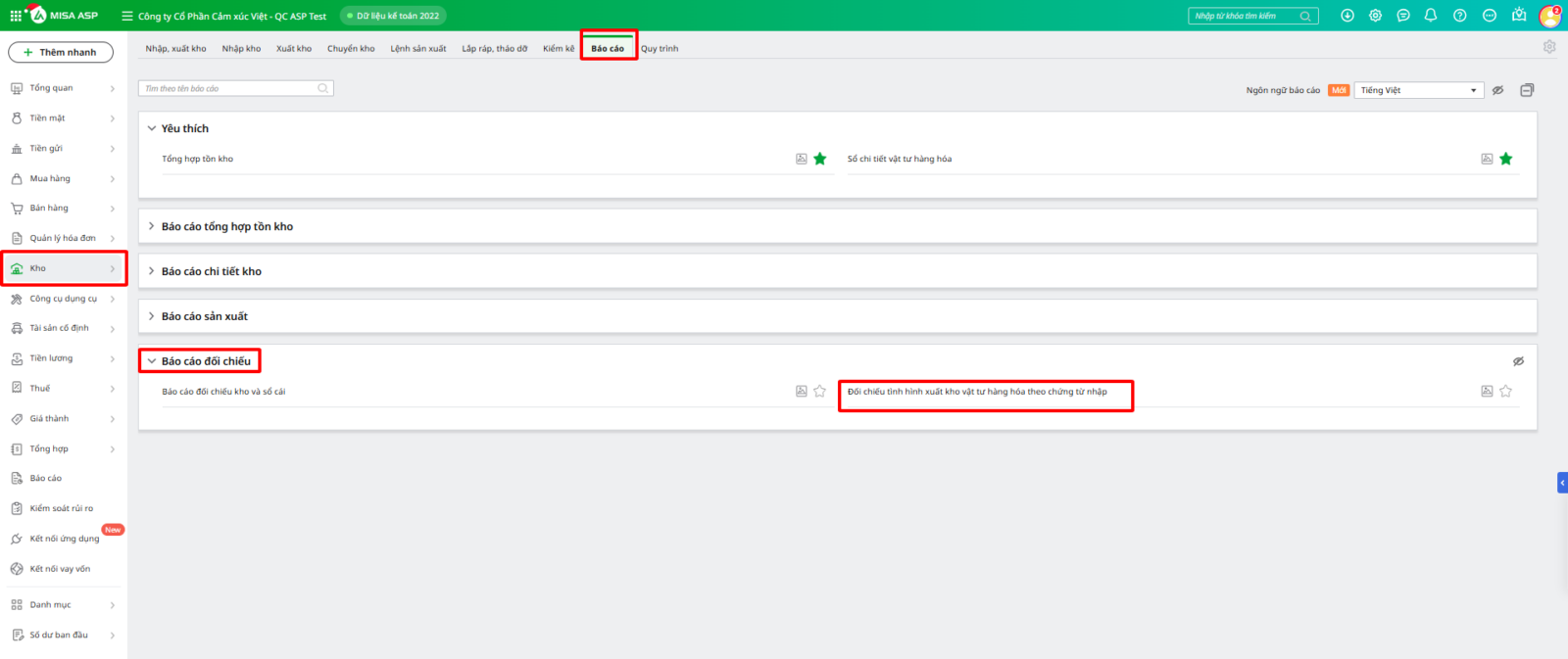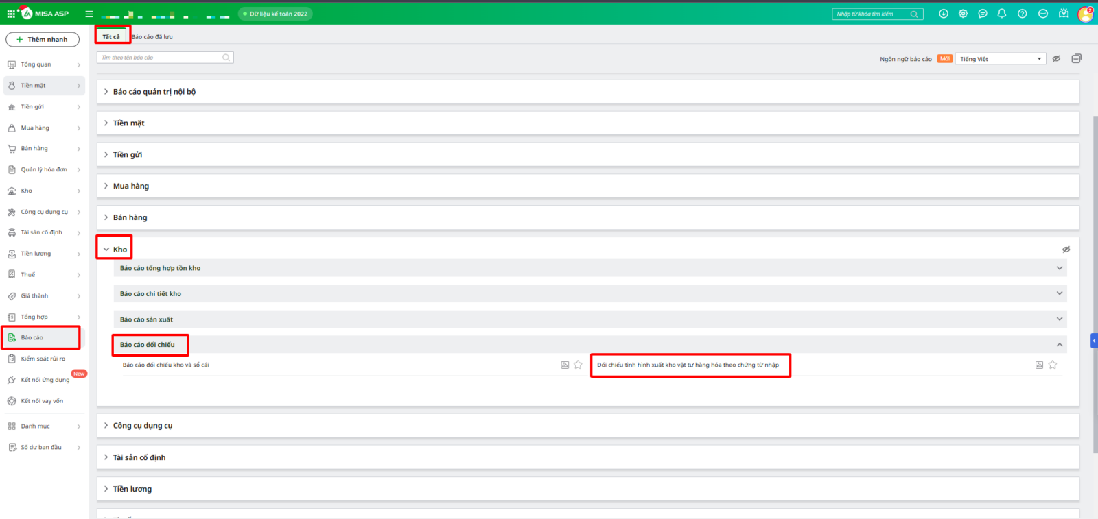 - Hoặc vào Báo cáo\Tất cả, chọn nhóm báo cáo Kho\Báo cáo đối chiếu\Đối chiếu tình hình xuất kho vật tư hàng hóa theo chứng từ nhập: