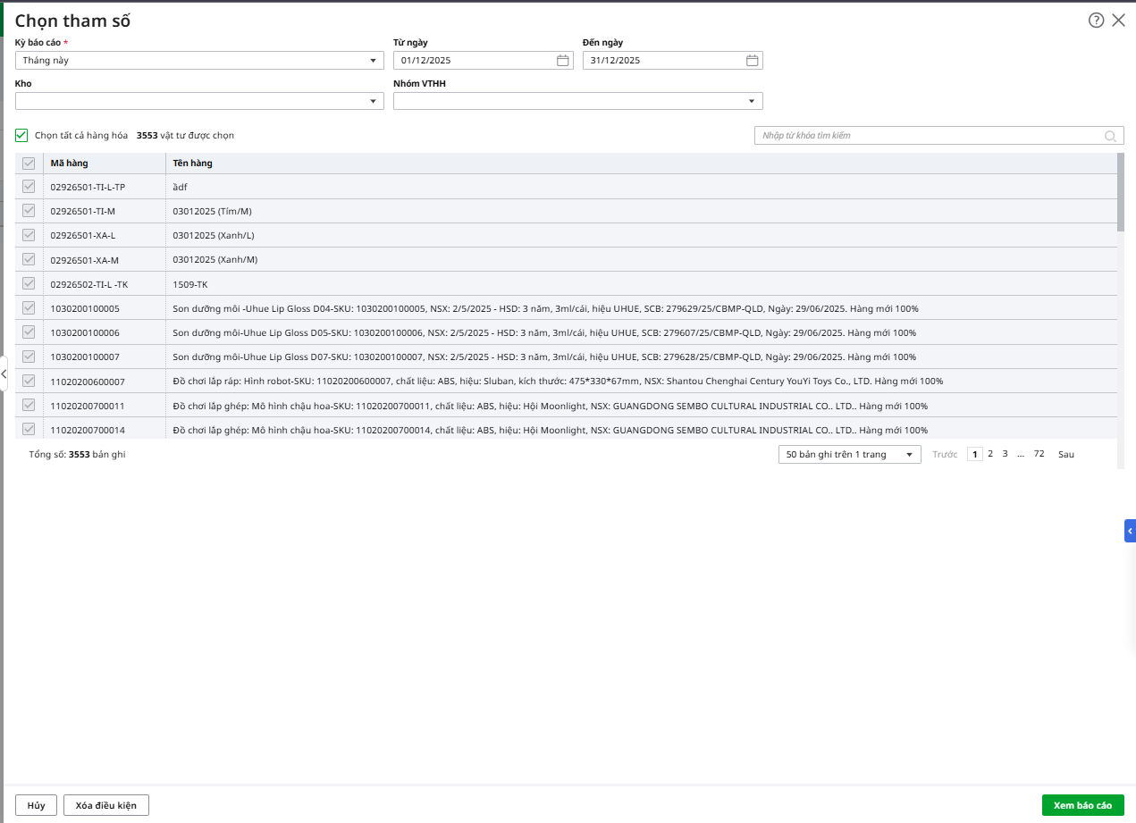 Bước 2: Nhấn Chọn tham số, thiết lập các tham số báo cáo liên quan: