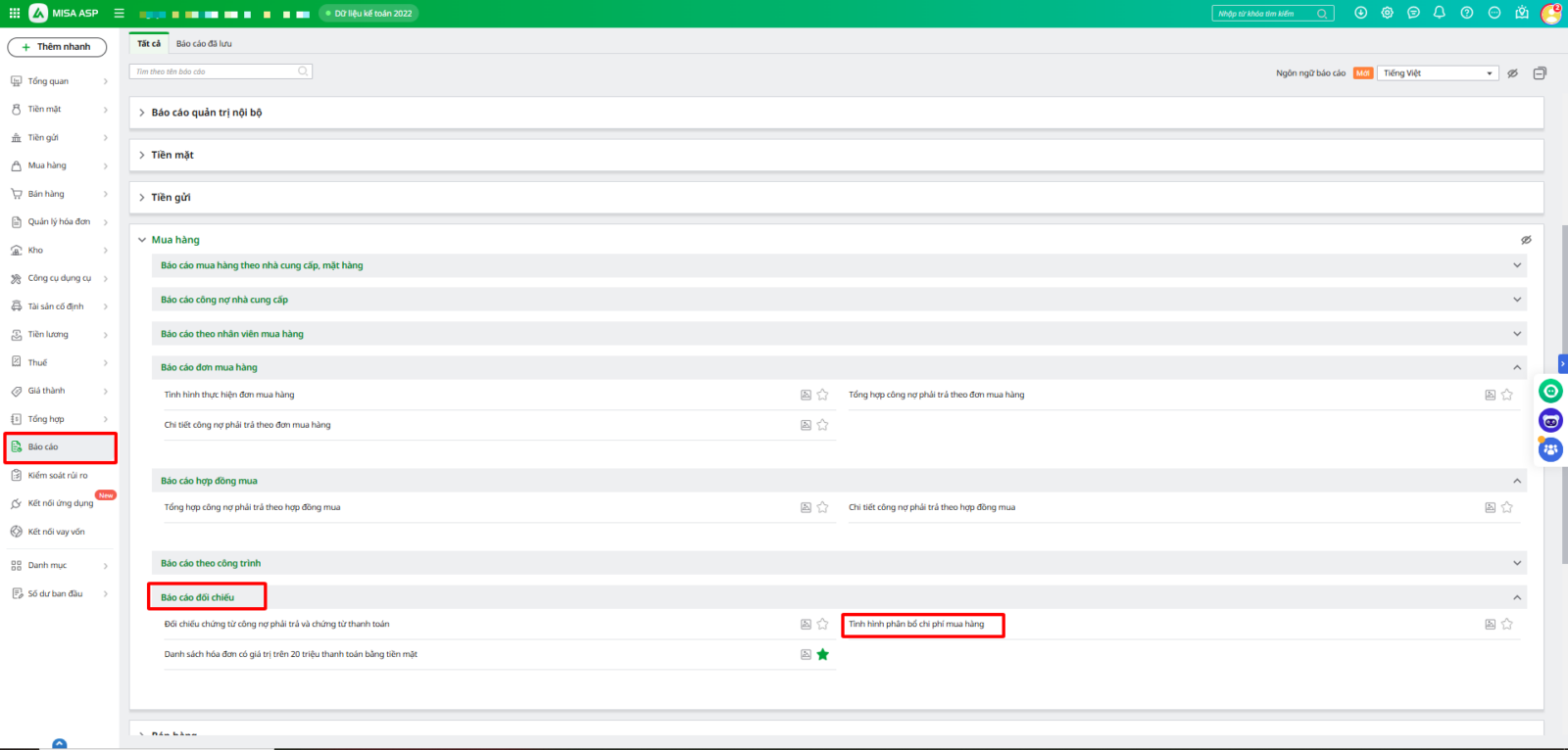 Mục đích: Hướng dẫn cách xem báo cáo tình hình phân bổ chi phí mua hàng trên phần mềm.