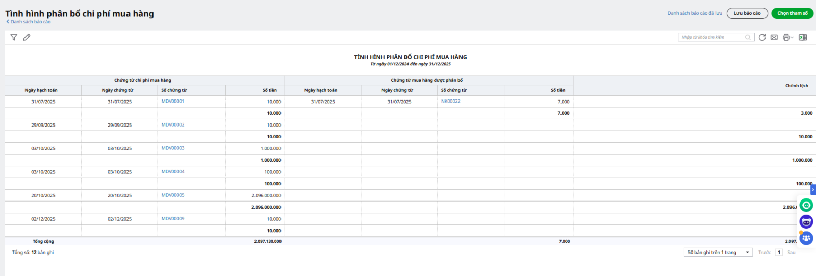 - Truy cập báo cáo tình hình phân bổ chi phí mua hàng.