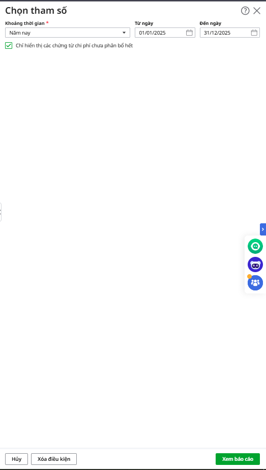 Lưu ý: Nếu chỉ muốn xem các chứng từ chi phí chưa phân bổ hết, tích chọn ô Chỉ hiển thị các chứng từ chưa phân bổ hết.