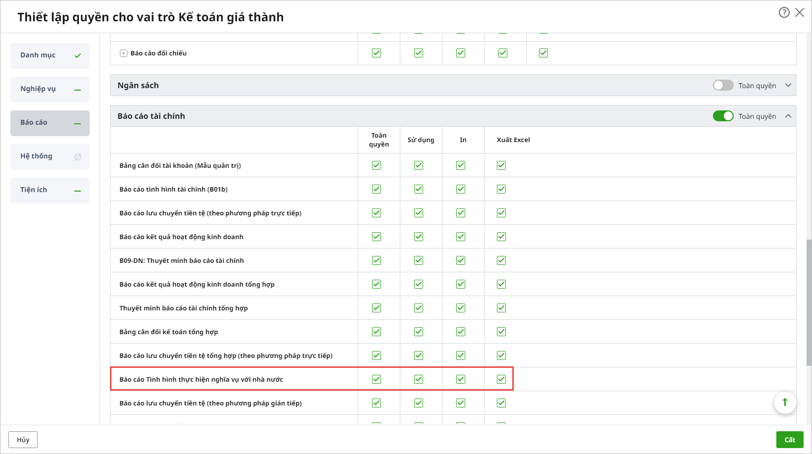 - Người dùng cần được phân quyền trên Tiện ích và thiết lập\ Vai trò quyền hạn để xem và làm việc với báo cáo Tình hình thực hiện nghĩa vụ với nhà nước. Xem chi tiết việc phân quyền theo hướng dẫn tại đây: