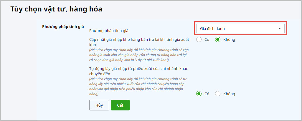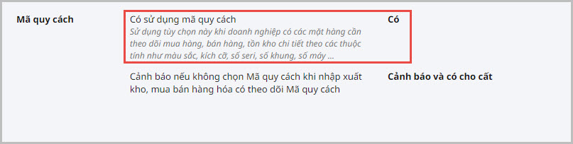 Lưu ý: Báo cáo tồn kho theo chứng từ nhập chi tiết mã quy cách chỉ hiển thị khi thỏa mãn đồng thời 2 điều kiện sau trên Tùy chọn vật tư hàng hóa: