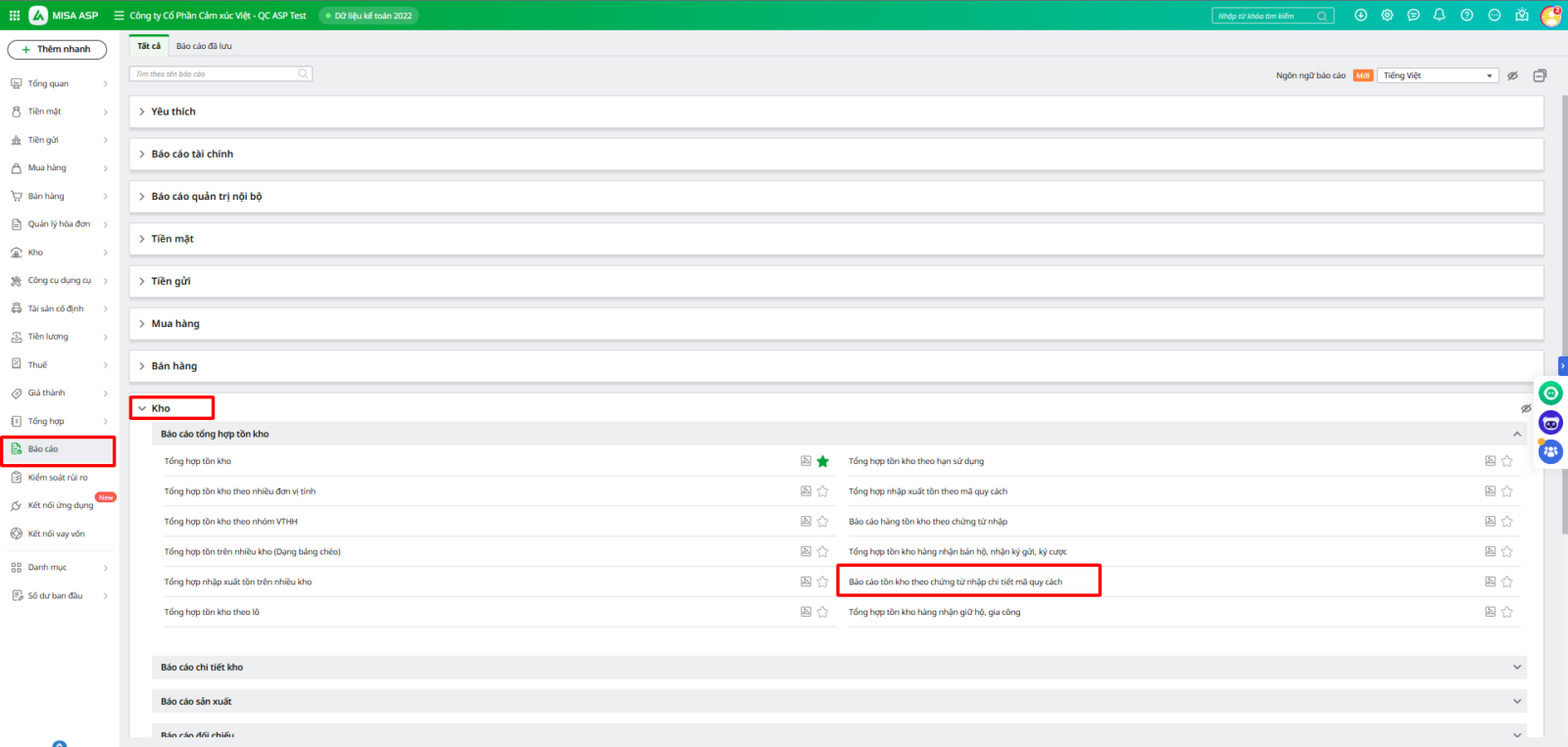 Bước 1: Vào phân hệ Kho, tab Báo cáo, chọn Báo cáo tồn kho theo chứng từ nhập chi tiết mã quy cách: