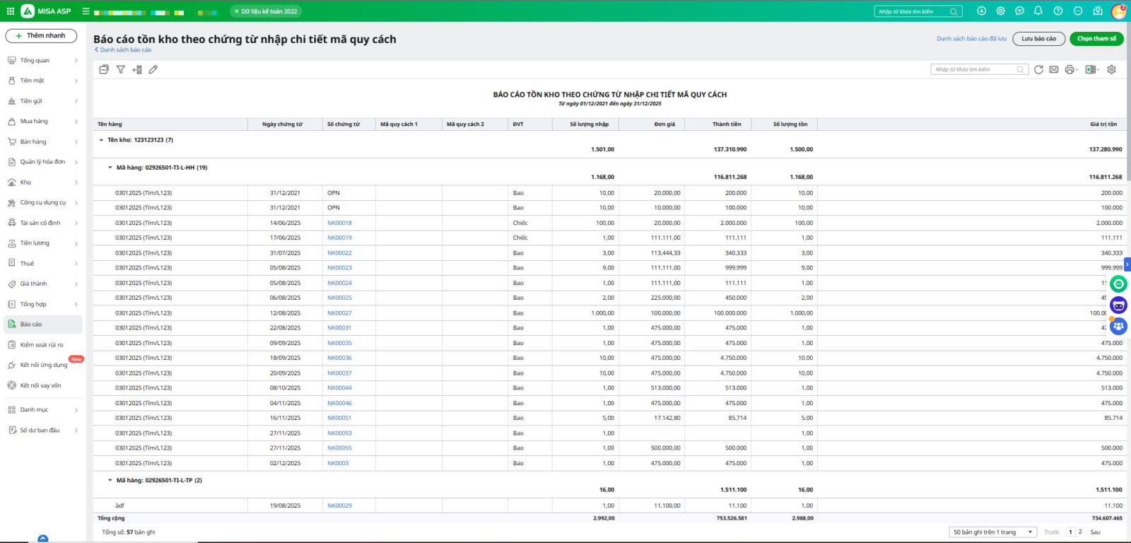 Để xem Báo cáo tồn kho theo chứng từ nhập chi tiết mã quy cách người dùng thực hiện như sau:
