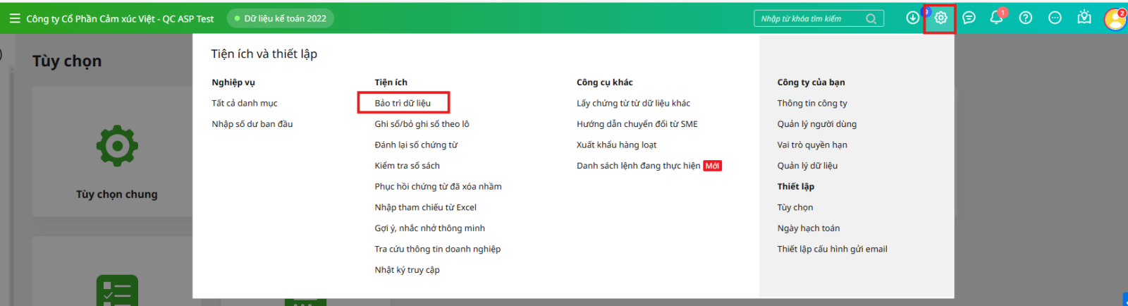 2.1. Bảo trì dữ liệuBước 1: Vào biểu tượng bánh răng ⚙ Tiện ích và thiết lập\Bảo trì dữ liệu
