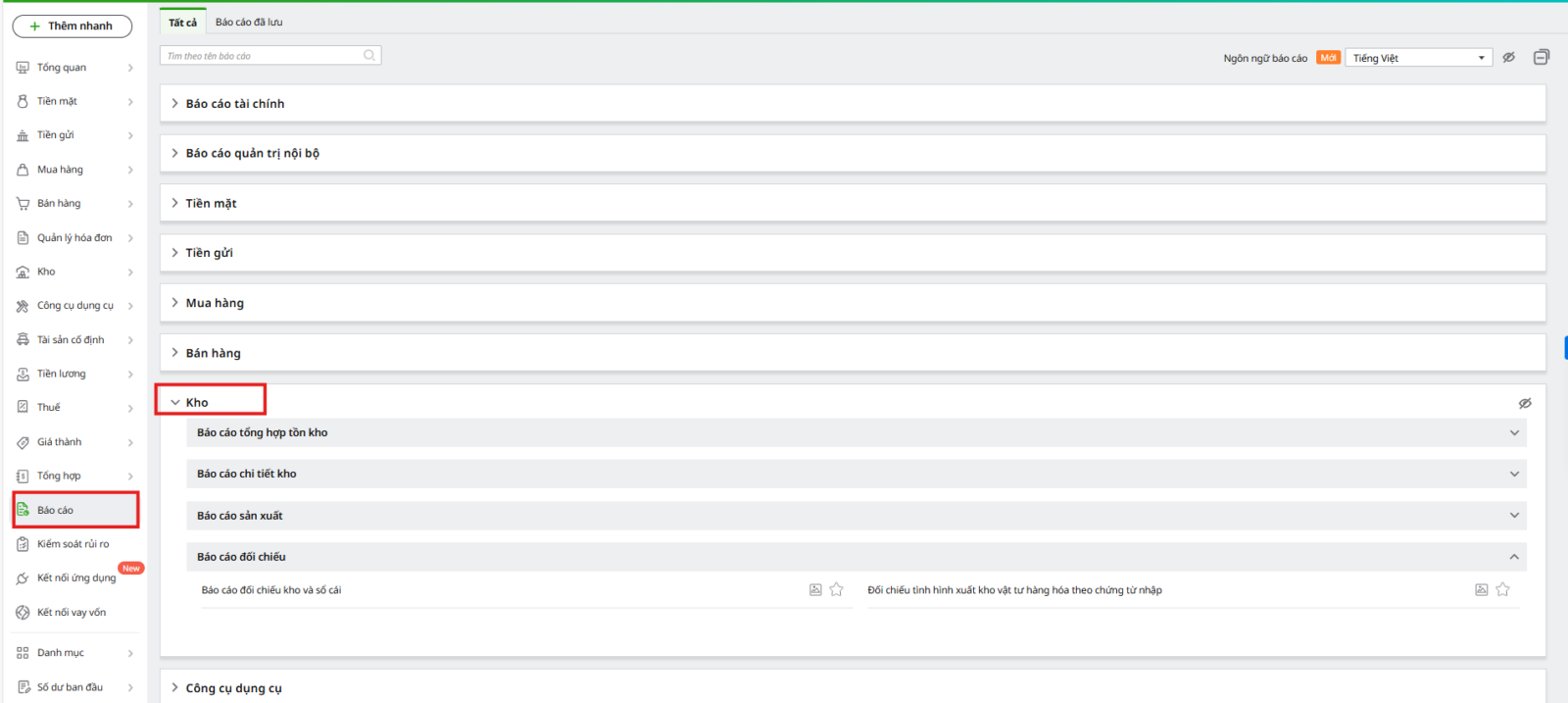 Bước 1: Vào phân hệ Kho\tab Báo cáo, sau đó chọn báo cáo cần xem.