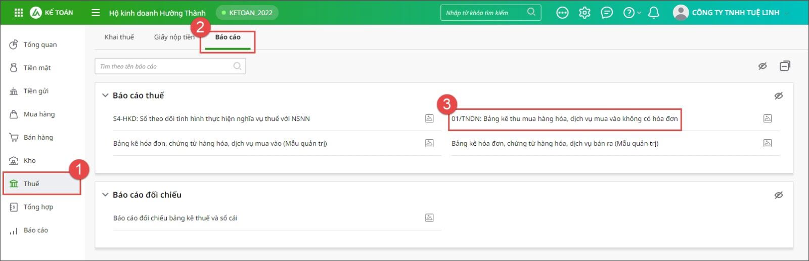 - Hoặc vào Báo cáo, chọn mục Thuế, chọn báo cáo 01/TNDN: Bảng kê thu mua hàng hóa, dịch vụ mua vào không có hóa đơn: