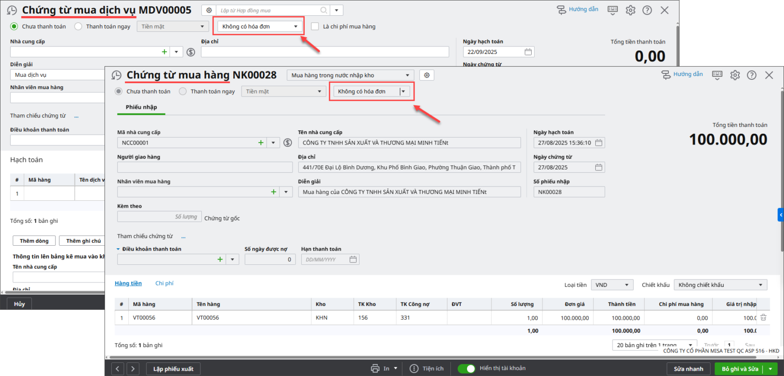 - Phần mềm chỉ đáp ứng đối với loại Chứng từ mua hàng hoặc Chứng từ mua dịch vụ, và phải chọn Không có hoá đơn.