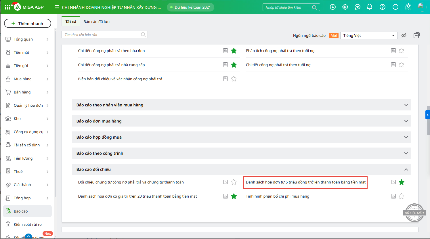 - Trên phân hệ Báo cáo, danh sách Báo cáo đối chiếu, chương trình bổ sung báo cáo Danh sách hóa đơn có giá trị lớn hơn hoặc bằng 5 triệu thanh toán bằng tiền mặt: