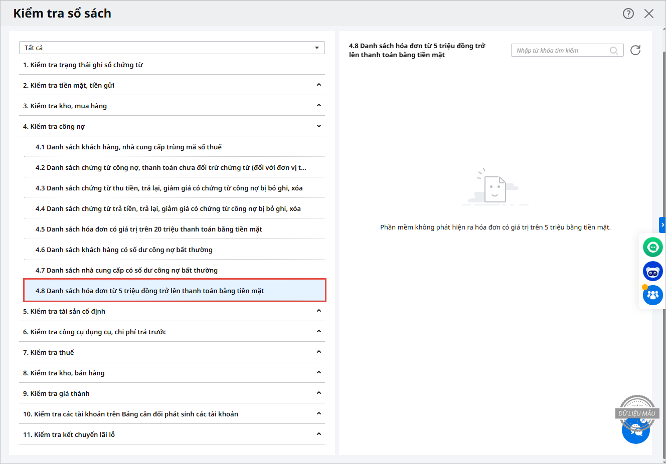 Nội dung: Bổ sung thêm báo cáo “Danh sách hóa đơn có giá trị lớn hơn hoặc bằng 5 triệu thanh toán bằng tiền mặt” và nội dung kiểm tra tương ứng trên chức năng “Kiểm tra sổ sách”.