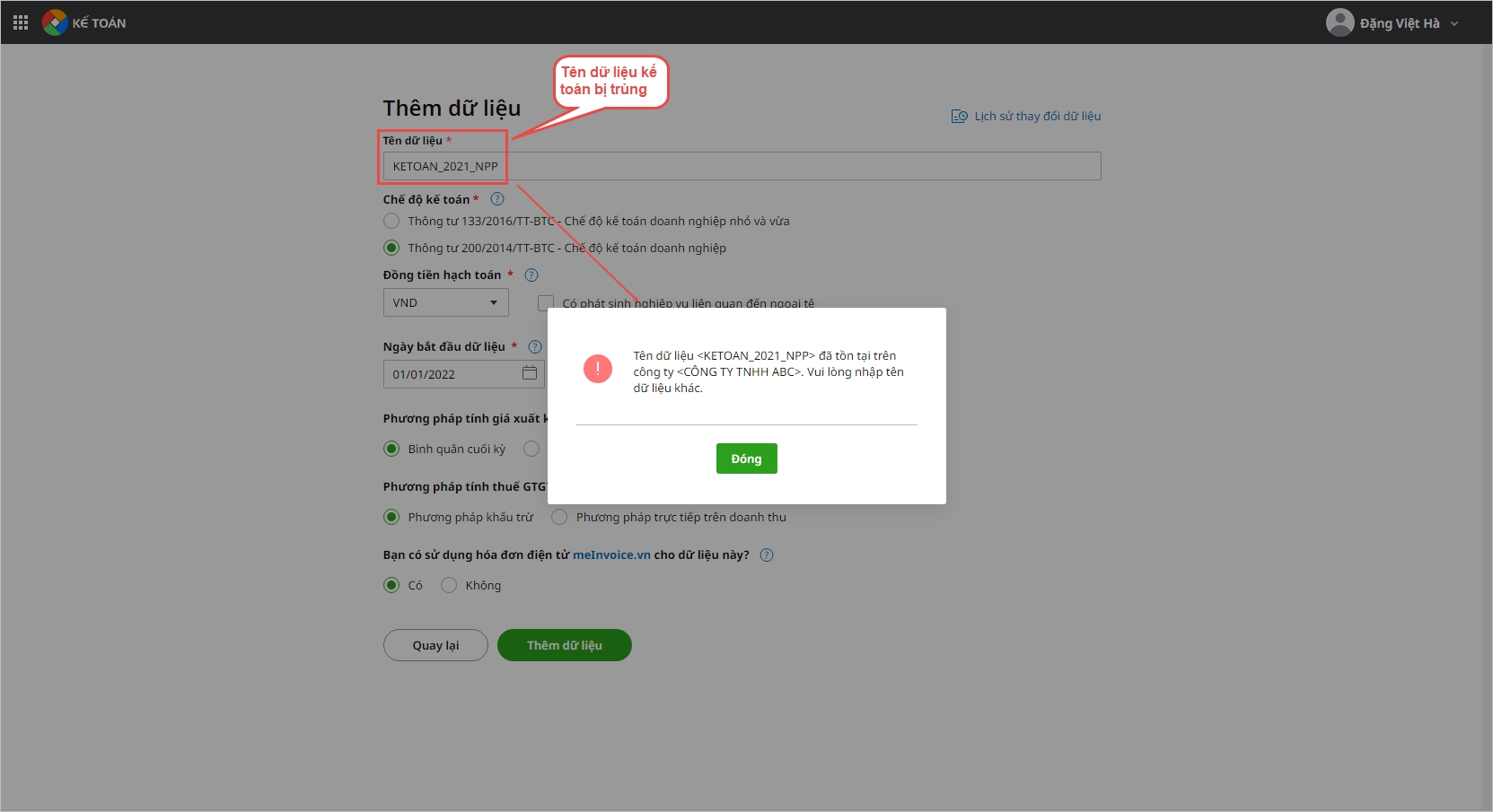Cụ thể, khi người dùng đặt tên cho dữ liệu kế toán mới mà trùng với dữ liệu kế toán đã tồn tại trong danh mục dữ liệu thì chương trình sẽ hiển thị cảnh báo: “Tên dữ liệu <…> đã tồn tại trên công ty <…>. Vui lòng nhập tên dữ liệu khác” .