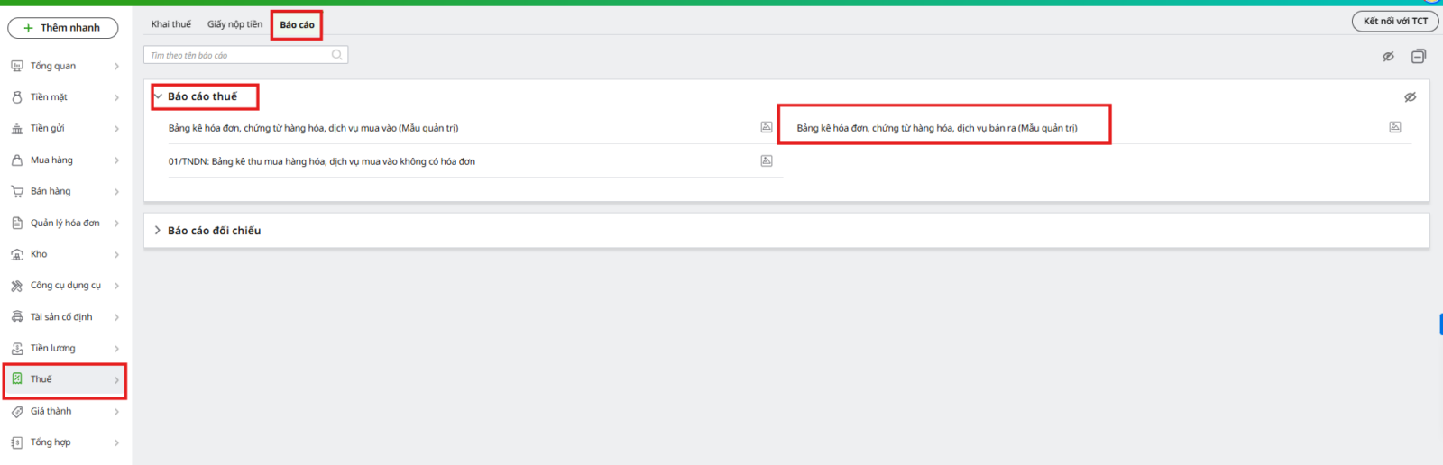Bước 1: Vào phân hệ Thuế\tab Báo cáo\nhóm Báo cáo thuế, chọn Bảng kê hóa đơn, chứng từ hàng hóa, dịch vụ bán ra (Mẫu quản trị) (hoặc vào mục Báo cáo\tab Tất cả\phân hệ Thuế\nhóm Báo cáo thuế, chọn Bảng kê hóa đơn, chứng từ hàng hóa, dịch vụ bán ra (Mẫu quản trị))