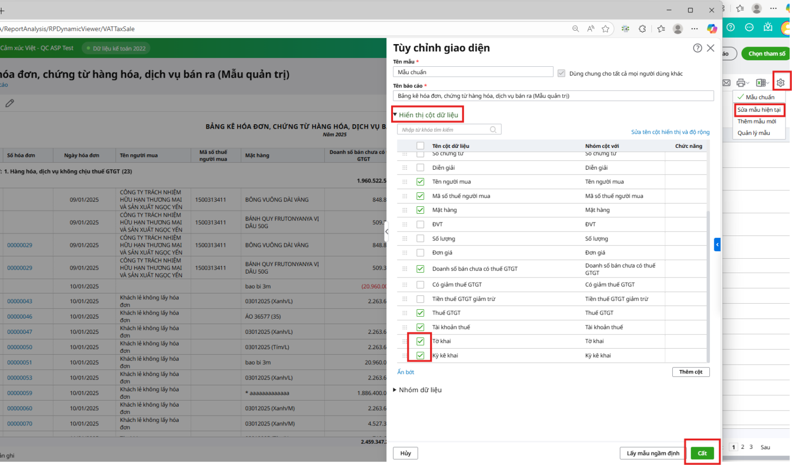 • Nếu báo cáo chưa hiển thị các thông tin bổ sung, thực hiện bằng cách nhấn vào biểu tượng bánh răng ⚙ Tùy chỉnh mẫu báo cáo\Sửa mẫu hiện tại, tại tab Hiển thị cột dữ liệu, tích chọn hiển thị các cột thông tin như Tờ khai và Kỳ kê khai, sau đó nhấn Cất.