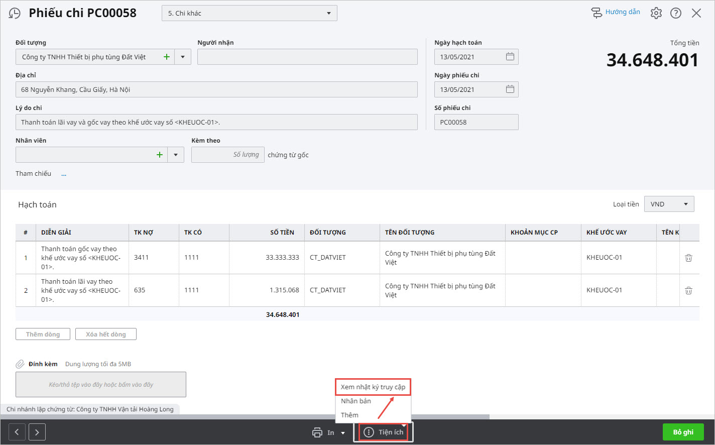 2.1 Truy cập nhật ký truy cập từ chứng từ