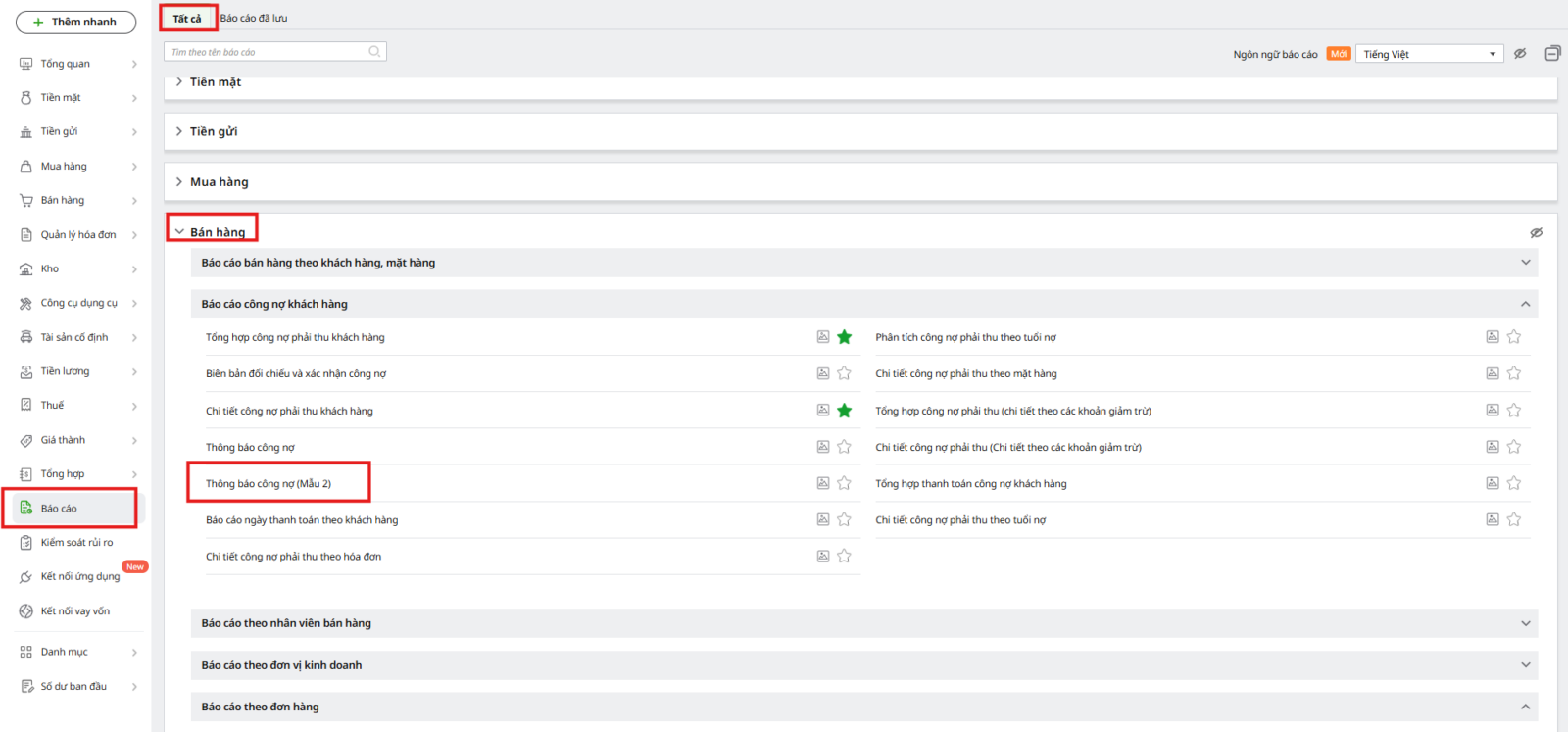 Bước 1: Vào Báo cáo\tab Tất cả\Bán hàng\Báo cáo công nợ khách hàng, chọn Thông báo công nợ (Mẫu 2)