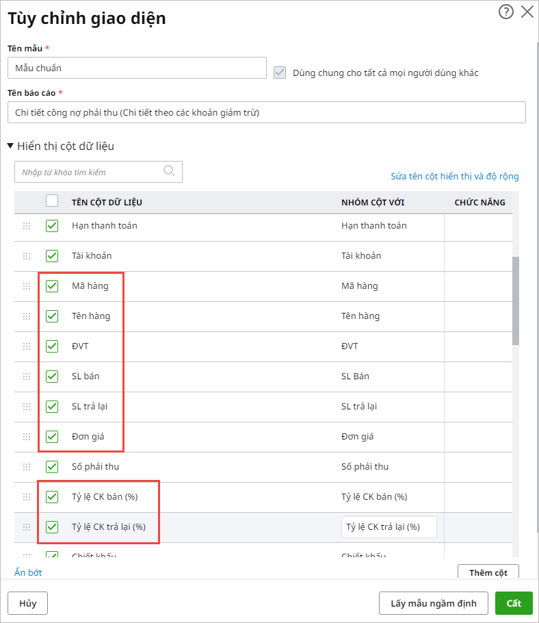 2.2. Bổ sung các cột thông tin mới trên giao diện báo cáo