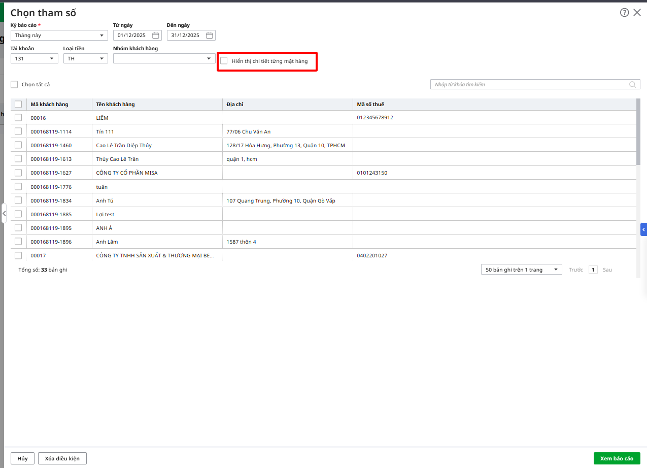• Bổ sung tùy chọn Hiển thị chi tiết từng mặt hàng tại giao diện chọn tham số (chương trình mặc định không tích chọn).