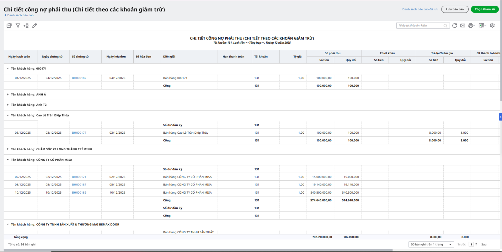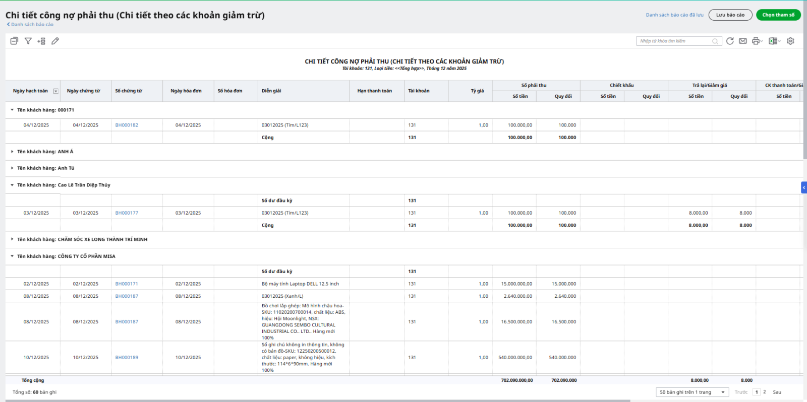 Mục đích: Bài viết hướng dẫn cách sử dụng và cập nhật các cột thông tin mới trên Báo cáo chi tiết công nợ phải thu khách hàng (chi tiết theo các khoản giảm trừ), giúp nâng cao khả năng theo dõi và phân tích dữ liệu công nợ.