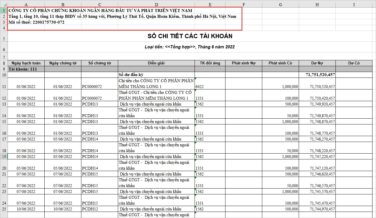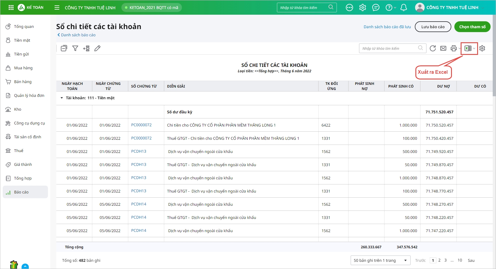 Ví dụ khi xuất báo cáo sổ chi tiết các tài khoản ra Excel:
