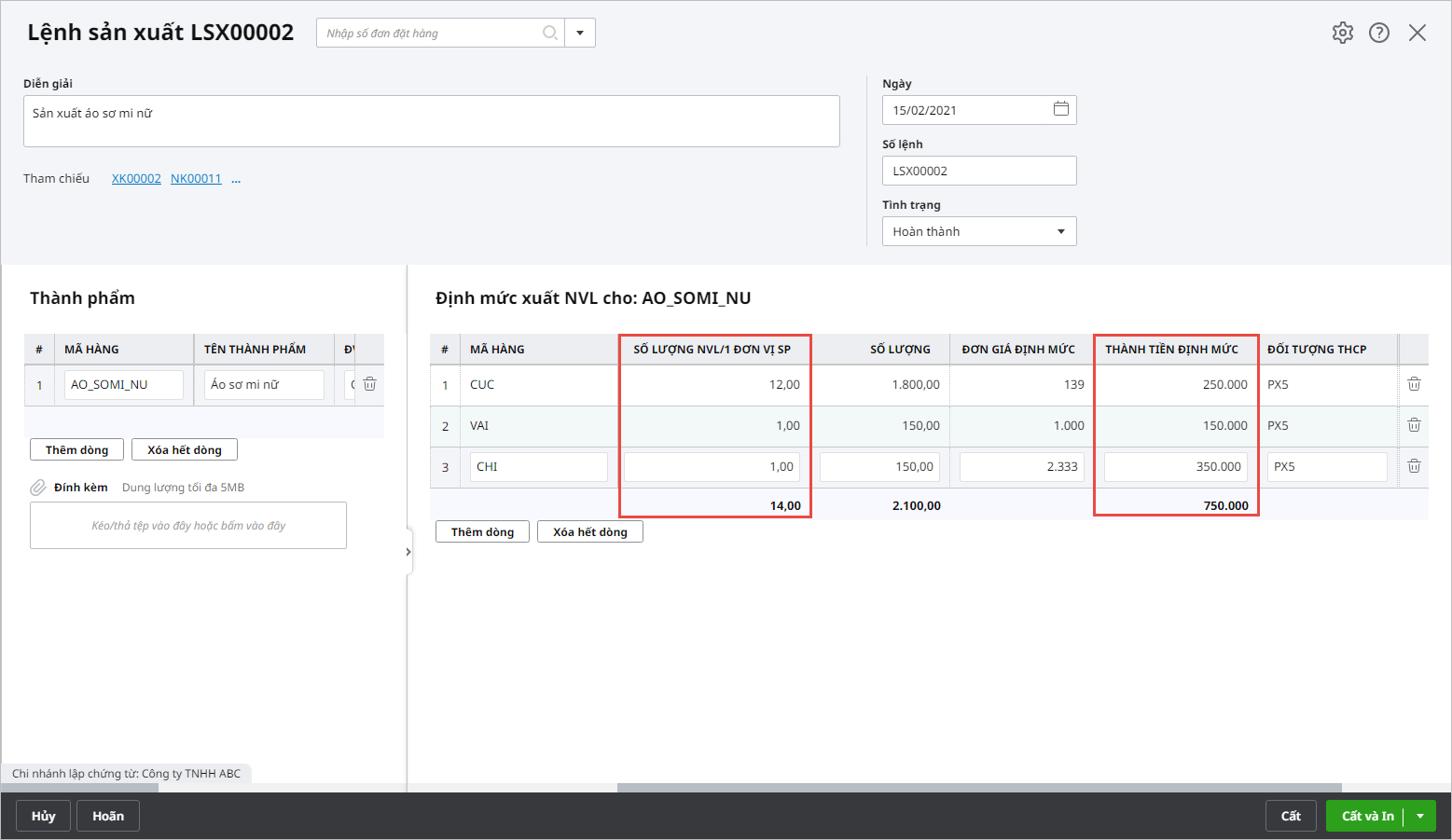 - Trên giao diện chi tiết Lệnh sản xuất, tại tab Định mức NVL cho thành phẩm, chương trình bổ sung tính tổng cho cột Số lượng NVL/1 Đơn vị SP và tính tổng cho cột Thành tiền định mức: