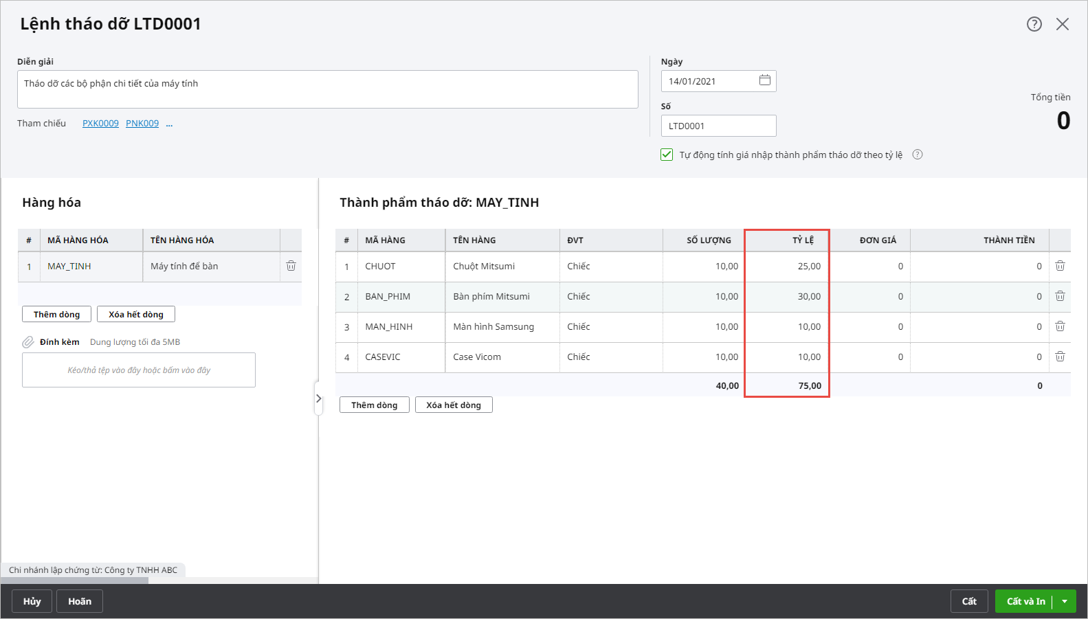 - Trên giao diện chi tiết Lệnh tháo dỡ, tại tab Thành phẩm tháo dỡ, chương trình bổ sung tính tổng cho cột Tỷ lệ: