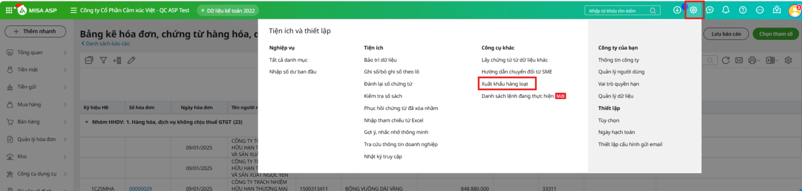 Bước 1: Vào Tiện ích và thiết lập, chọn Xuất khẩu hàng loạt