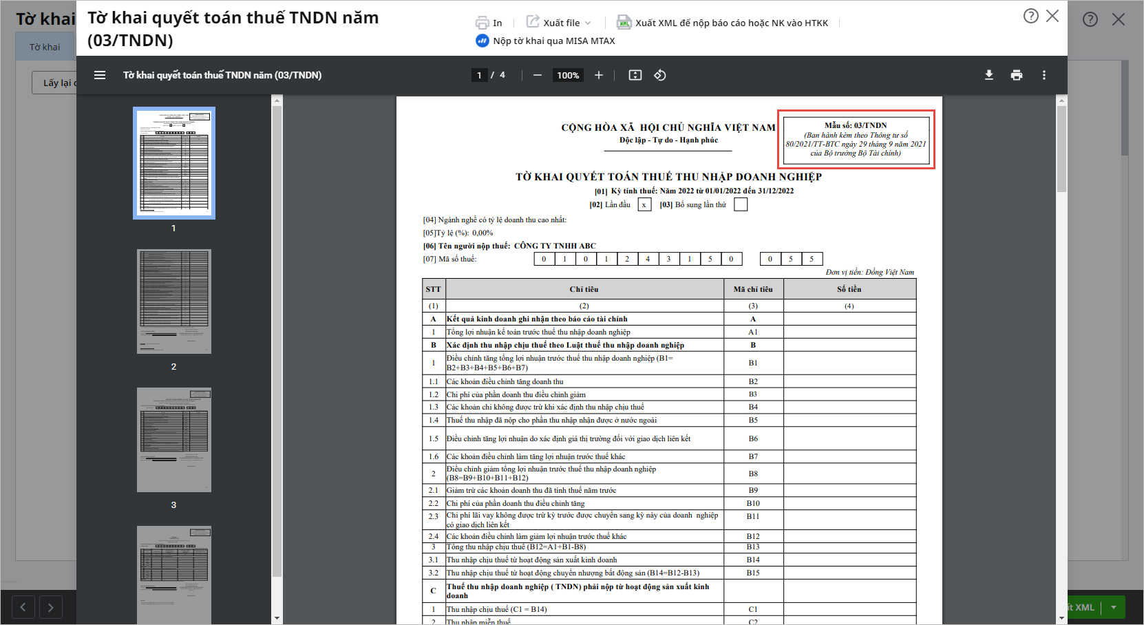Bước 4: Nhấn Đồng ý. Xuất hiện giao diện tờ khai quyết toán thuế TNDN.