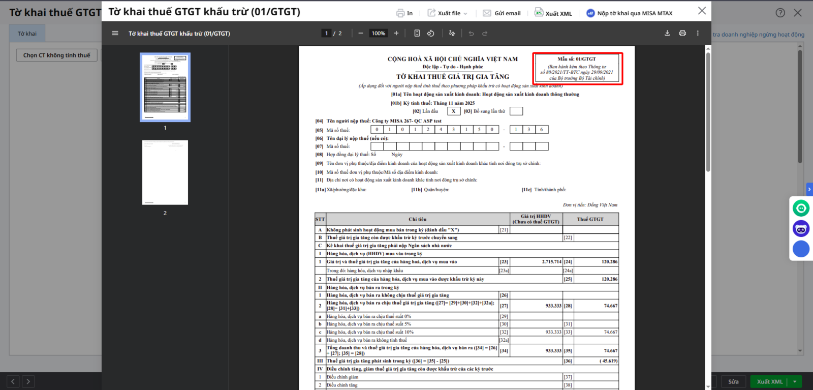 - Khi thực hiện lập tờ khai thuế GTGT khấu trừ (01/GTGT) với kỳ tính thuế từ ngày 01/01/2022 trở đi, chương trình sẽ hiển thị Thông tư áp dụng là TT80/2021/TT-BTC và cập nhật các mẫu biểu, phụ lục theo mẫu của Thông tư 80/2021/TT-BTC: