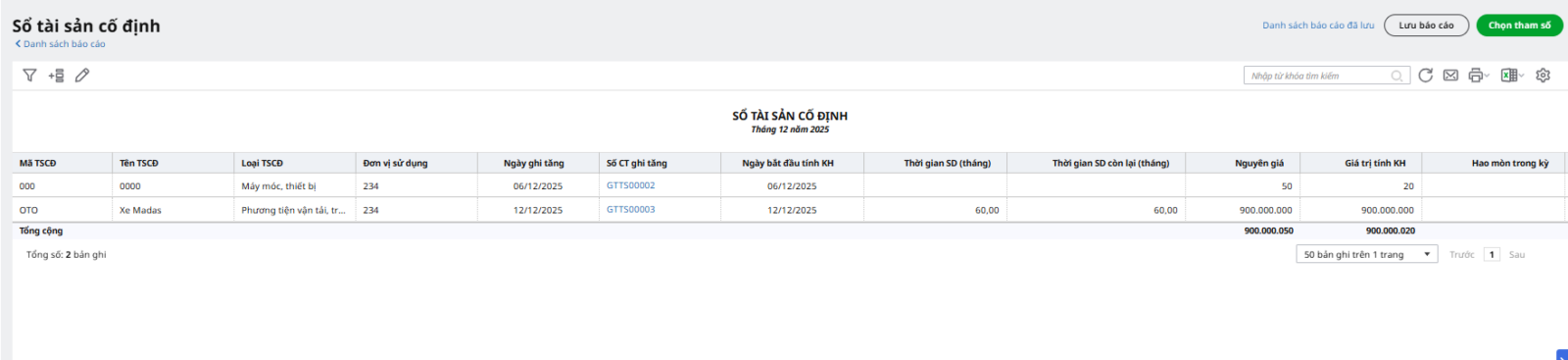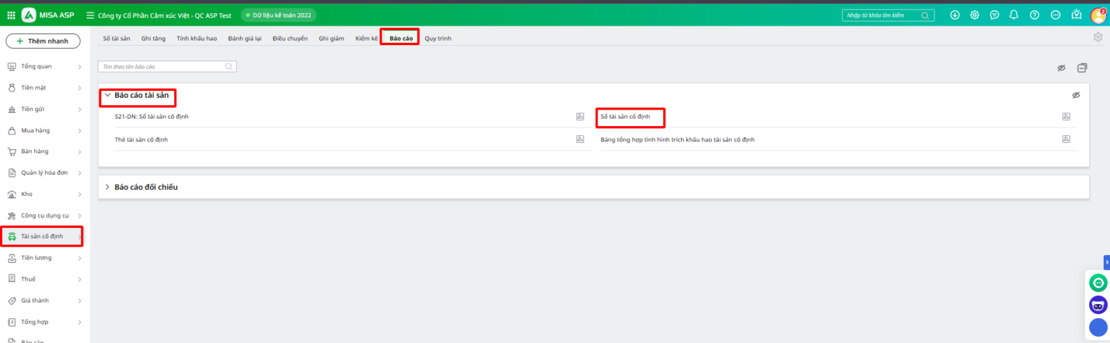 Bước 1: Trên phân hệ Báo cáo\Tài sản cố định\mục Báo cáo tài sản, chọn Sổ tài sản cố định.
