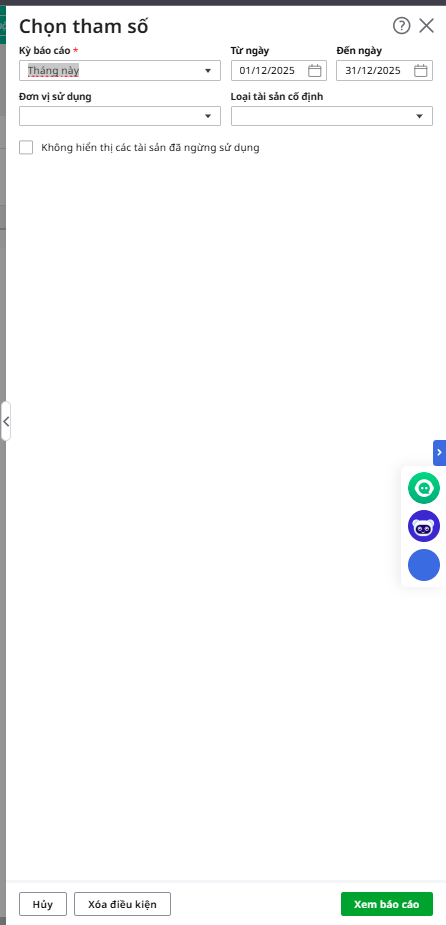 - Tùy chọn Không hiển thị các tài sản đã ngừng sử dụng trên giao diện chọn tham số của báo cáo Sổ tài sản cố định.