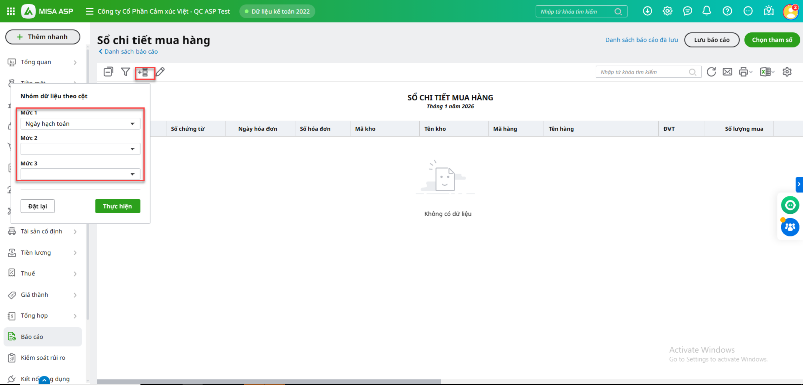 Lưu ý: Để tích được vào Xuất mỗi nhóm báo cáo trên 1 sheet riêng, cần phải chọn nhóm cột theo mức 1 , mức 2, mức 3