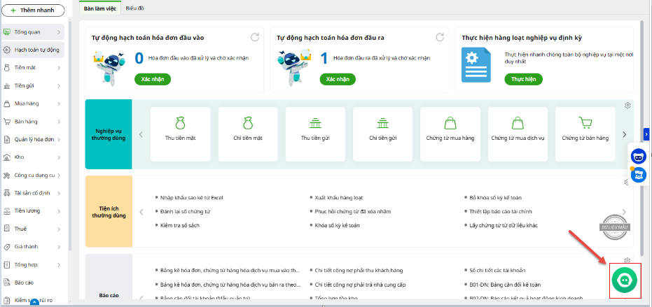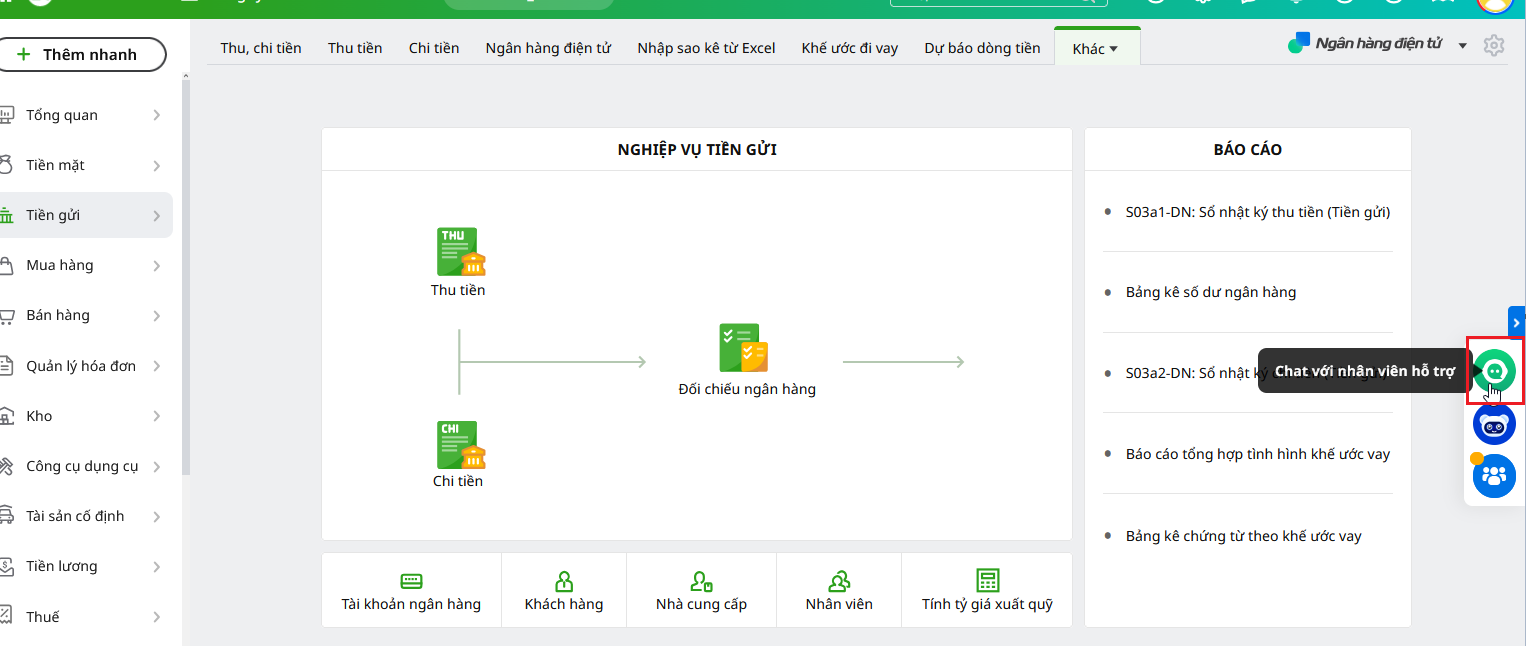 Để sử dụng, Quý khách cần đăng nhập vào phần mềm, bấm vào biểu tượng hộp thoại CHAT VỚI NHÂN VIÊN HỖ TRỢ ở góc phải màn hình.