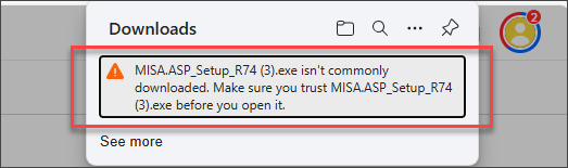 • Biểu hiện: Khi nhấn tải bộ cài, trình duyệt web hiện thông báo “MISA.ASP_Setup_R…exe isn’t commonly downloaded. Make sure you trust … before you open it”