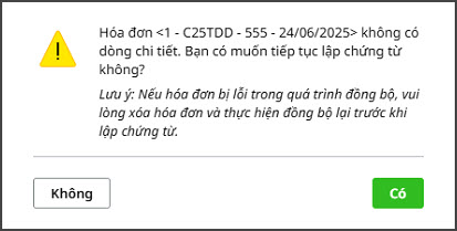 • Biểu hiện: Hiện thông báo “Hoá đơn … không có dòng chi tiết. Bạn có muốn tiếp tục lập chứng từ không? Lưu ý: Nếu hoá đơn bị lỗi trong quá trình đồng bộ, vui lòng xoá hoá đơn và thực hiện đồng bộ lại trước khi lập chứng từ.”
