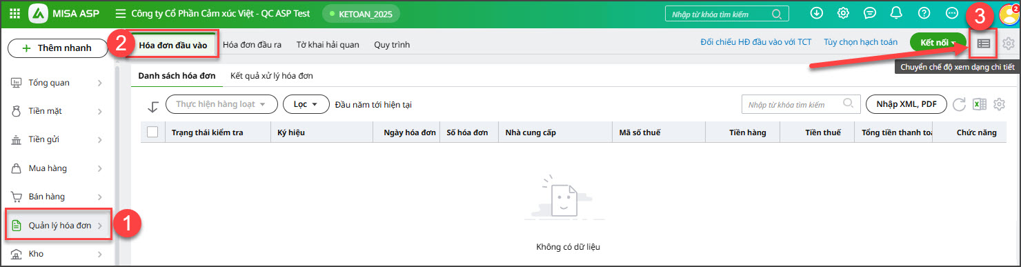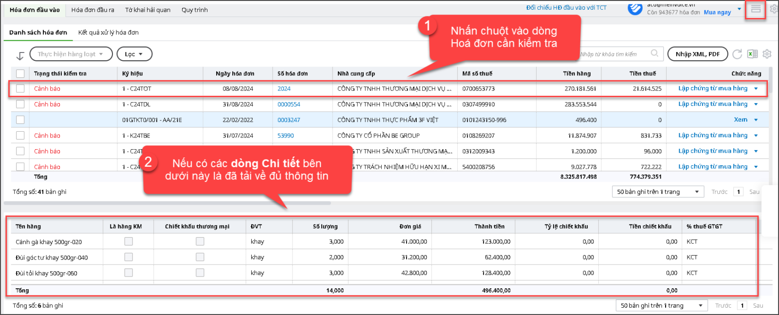 • Cách kiểm tra: Để biết hóa đơn đã về đủ Thông tin chung và Thông tin các dòng chi tiết, bạn thực hiện như sau: