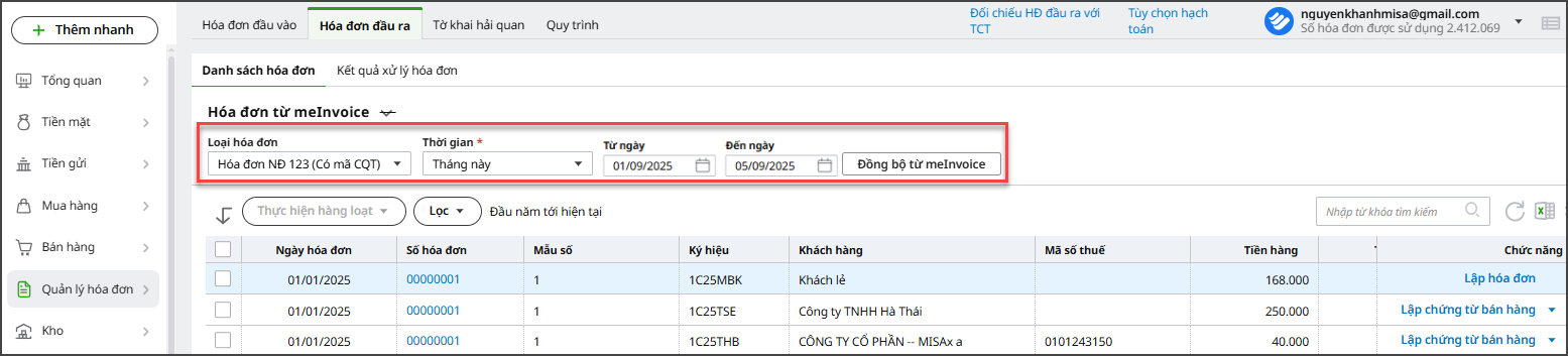 – Hoặc khi chọn khoảng thời gian để đồng bộ thì bạn chia nhỏ khoảng thời gian (ví dụ cần lấy hoá đơn của Tháng 9 thì chọn từ ngày 01/9 đến 01/9, sau khi hoá đơn ngày 01/9 về đủ thông tin thì đồng bộ ngày tiếp theo…)