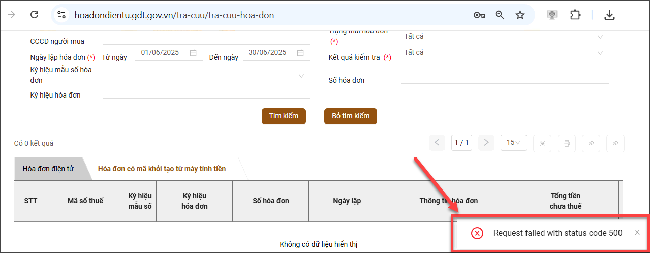 • Cách kiểm tra: Đăng nhập vào trang web https://hoadondientu.gdt.gov.vn/ và tra cứu hoá đơn, khi Tìm kiếm sẽ báo lỗi “Request failed with status code 500”