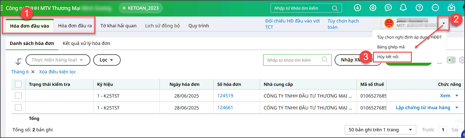 Bước 1: Hủy kết nối Cơ quan thuế.