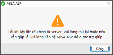 • Biểu hiện: Khi đồng bộ hóa đơn báo Lỗi khi lấy file cấu hình từ server. Vui lòng thử lại hoặc nếu vẫn gặp lỗi vui lòng liên hệ MISA ASP để được trợ giúp