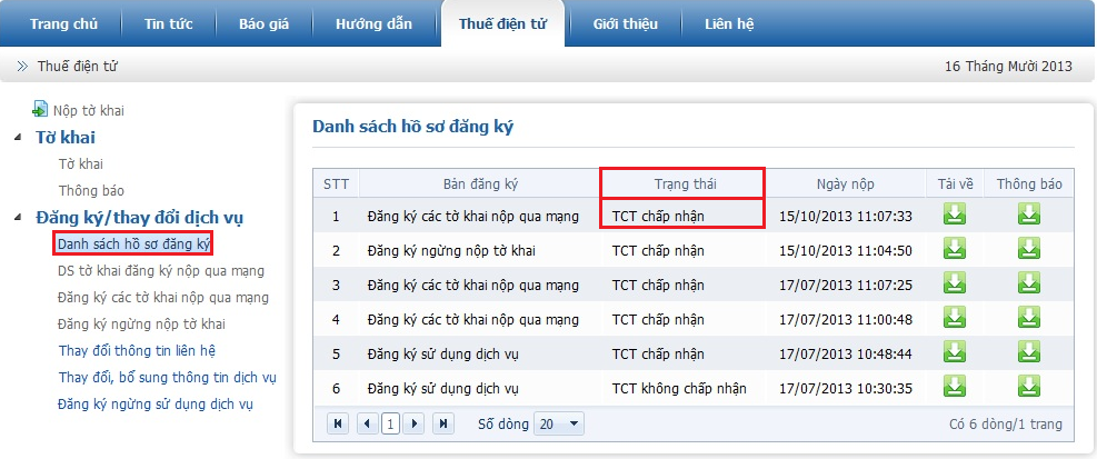 Sau khi thực hiện 2 bước trên thì đợi Tổng cục thuế xác nhận đồng ý và thực hiện nộp lại tờ khai theo Quý là được. Lưu ý: Có thể theo dõi trạng thái duyệt hồ sơ bằng cách vào menu Thuế điện tử → Đăng ký/Thay đổi dịch vụ → Danh sách hồ sơ đăng ký. Xem thông tin cột Trạng thái. Trong trường hợp trạng thái là Không chấp nhận thì nhấn vào mũi tên tải về tại cột Thông báo để tải về nguyên nhân không được chấp nhận.