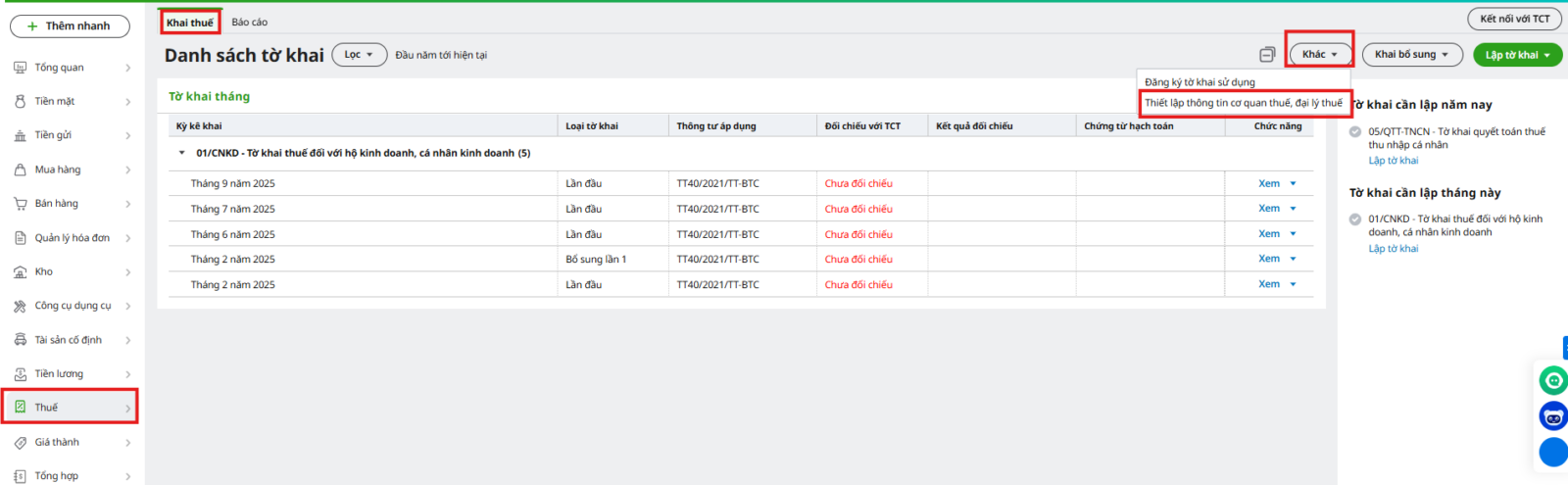 Nguyên nhân: Do xuất tờ khai XML từ Phần mềm hoặc từ HTKK nhưng không có nhập MST cũ, dẫn đến trên file tờ khai bị bỏ trống hoặc đang điền nhầm là số CCCD. Cách xử lý: Bước 1: Vào phân hệ Thuế\tab Khai thuế\mục Khác\chọn Thiết lập cơ quan thuế, đại lý thuế