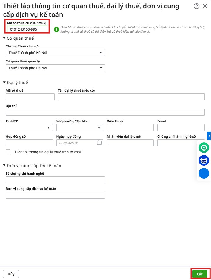 Bước 2: Trên giao diện thiết lập thông tin, gõ mã số thuế cũ của đơn vị và nhấn Cất