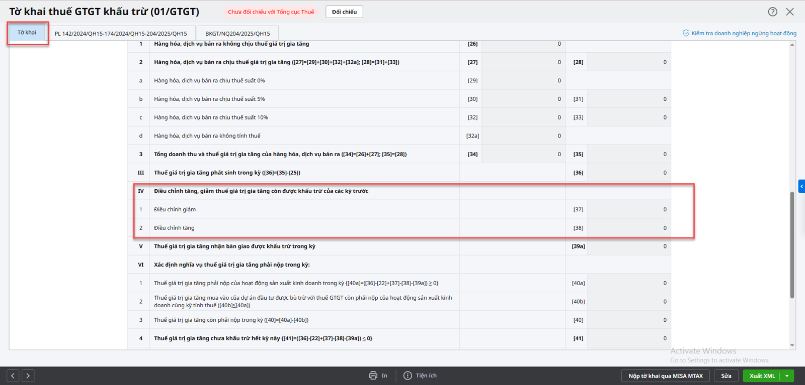 – Số dương → ghi vào chỉ tiêu 38 (điều chỉnh tăng thuế GTGT còn được khấu trừ).