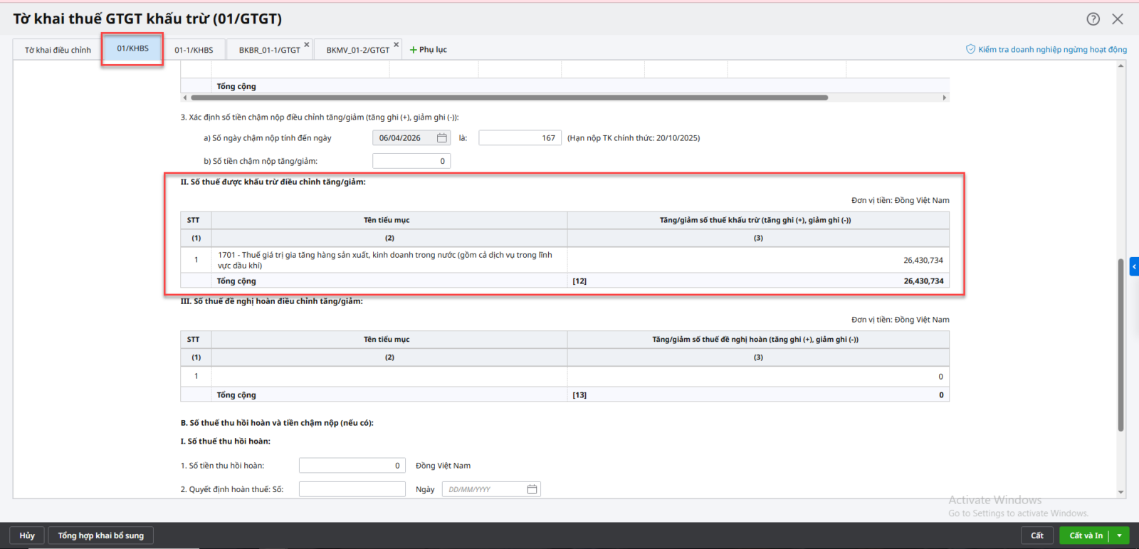 3.2.1 Điều chỉnh tăng/giảm số thuế GTGT còn được khấu trừ theo tờ khai bổ sung (01/KHBS)