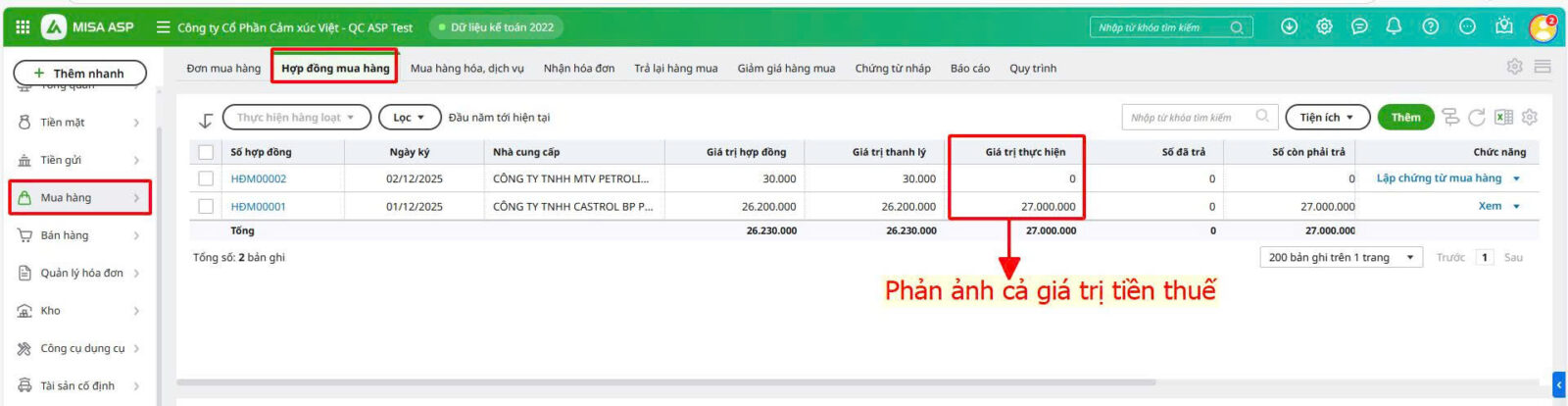 Bài viết hướng dẫn về cải tiến trong việc tính giá trị đã thực hiện của hợp đồng mua trên phần mềm MISA.
