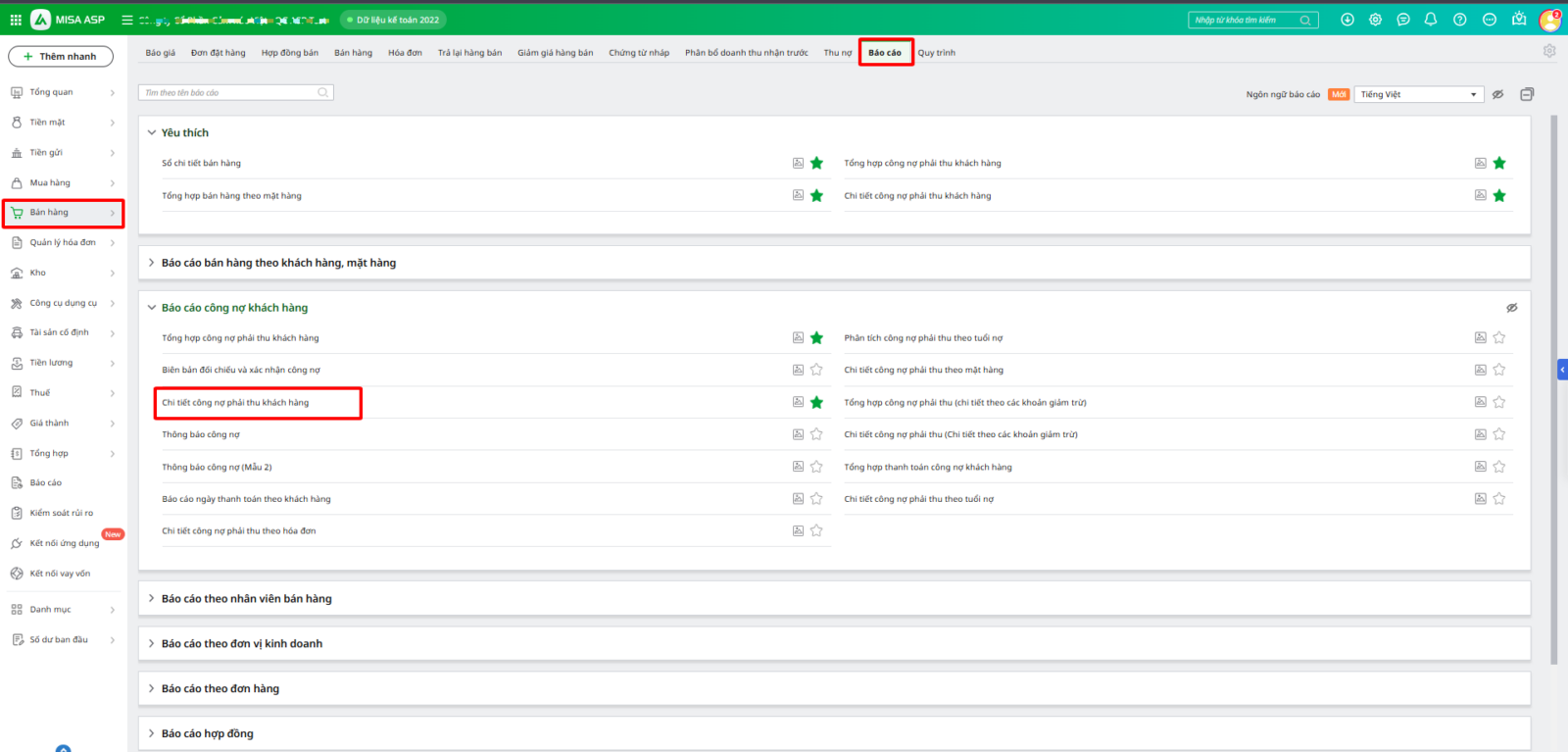 Bước 1: Vào Báo cáo\Bán hàng, tại nhóm Báo cáo công nợ khách hàng, chọn Chi tiết công nợ phải thu khách hàng