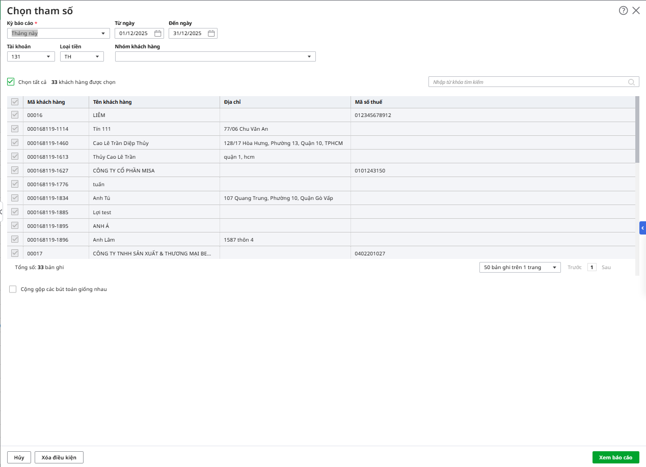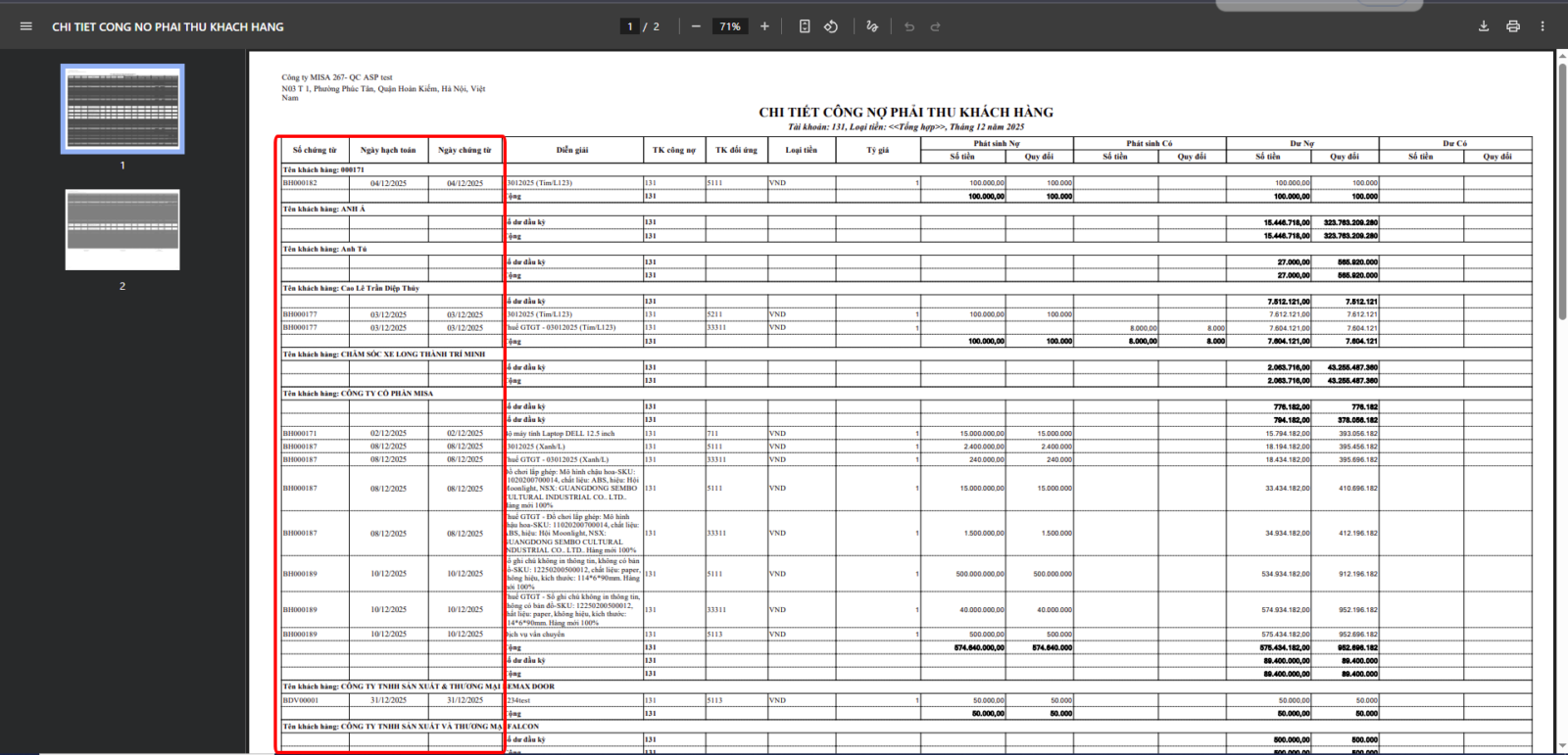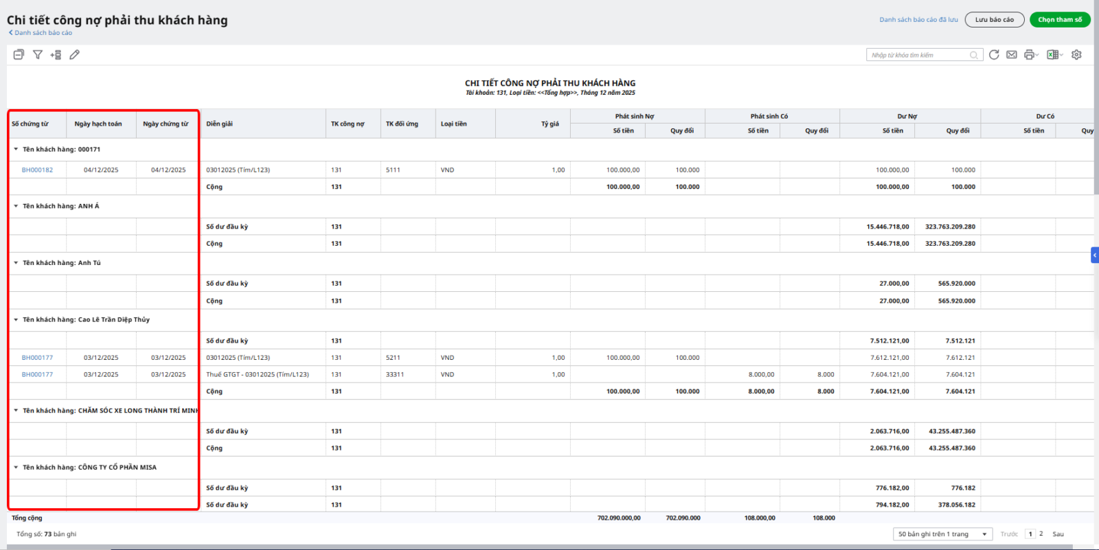 Ví dụ: Khi xem báo cáo Chi tiết công nợ phải thu khách hàng: