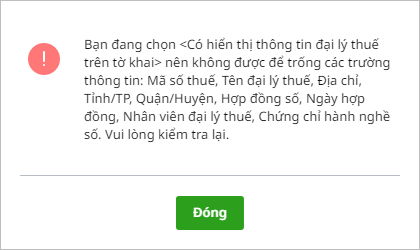 Mục đích: Hướng dẫn cách hiển thị cảnh báo khi tích chọn hiển thị thông tin đại lý thuế nhưng bỏ trống các trường thông tin bắt buộc, giúp người dùng nhận biết và bổ sung thông tin cần thiết.